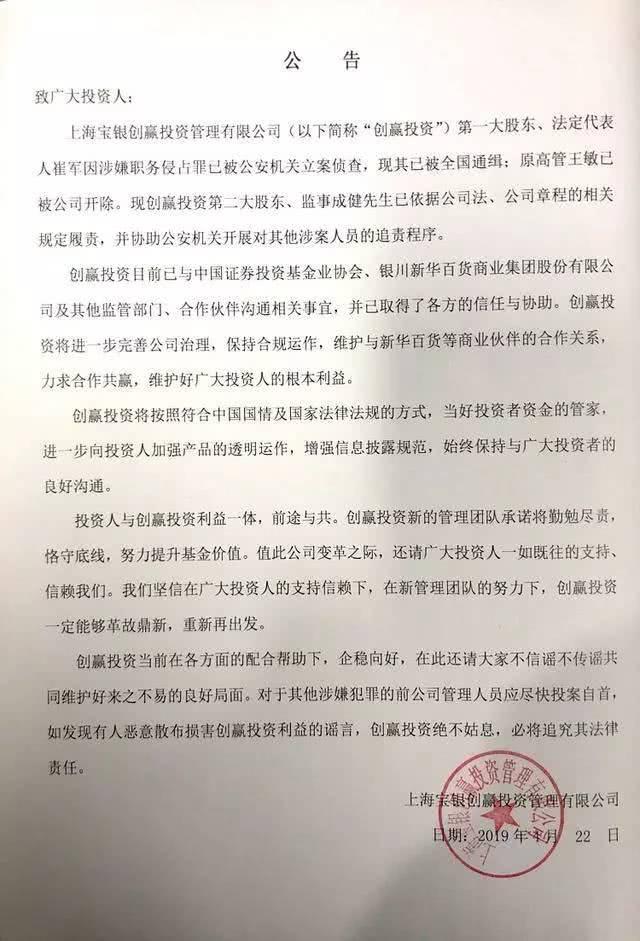 据《中国经营报》报道,刚被免职的创赢投资风控总监王敏表示,崔军没有到案。公安机关根本没有以崔军挪用基金财产立案,而且上海宝银的主管单位是证监会。